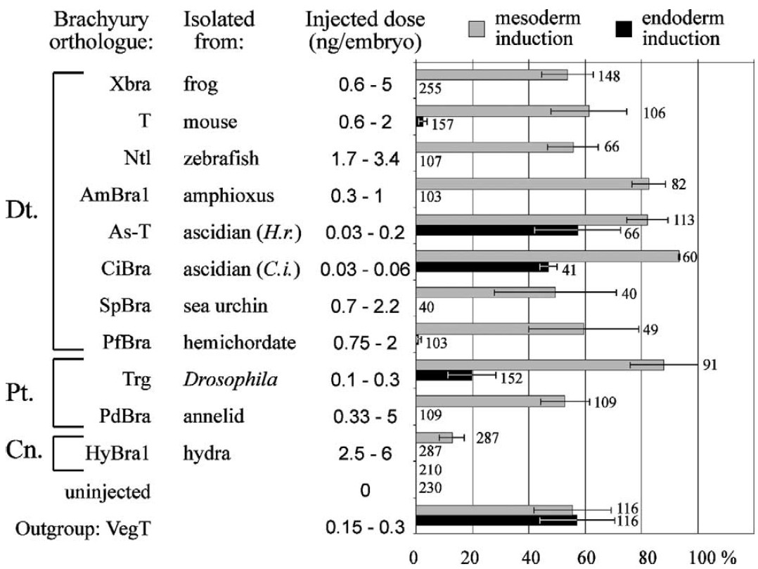 Fig. 1. Quantitative analysis of endoderm and striated muscle induction in response to misexpression of different Brachyury orthologues. Histogram showing