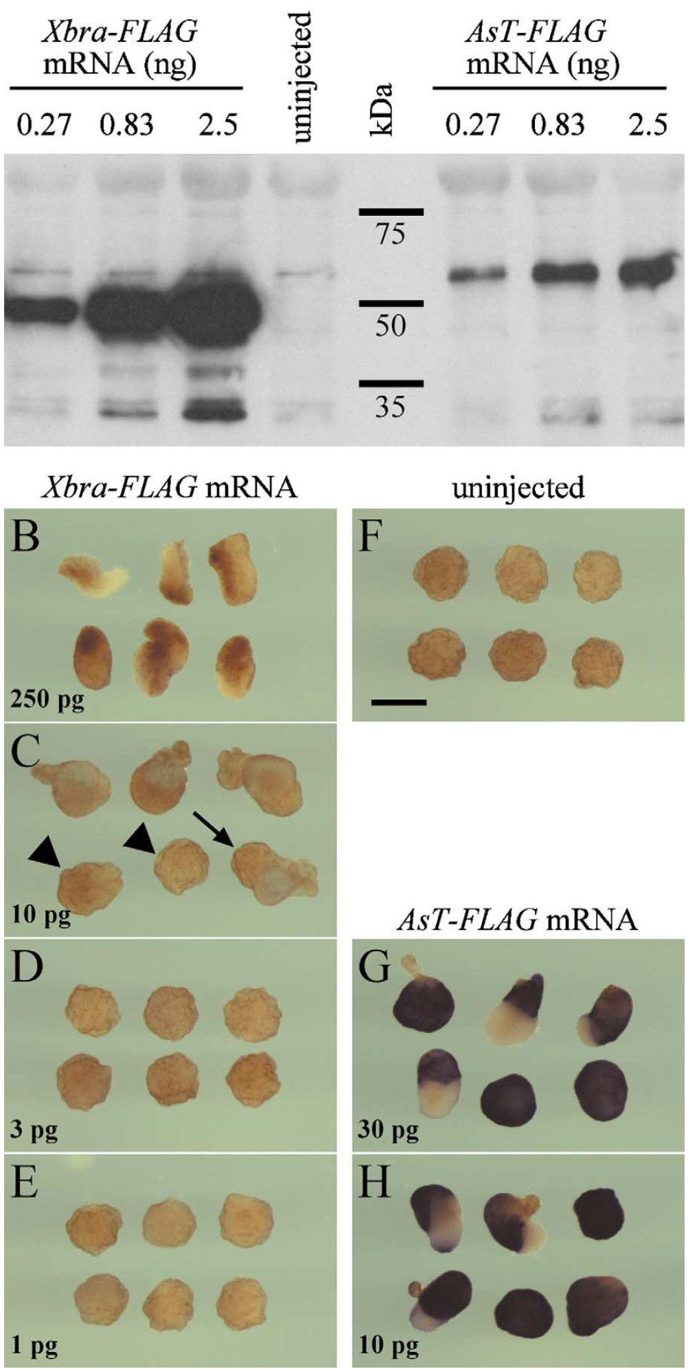 the indicated amount of synthetic mRNA coding either for the Xbra-FLAG or the AsT-FLAG protein. At stage 7, animal hemispheres where dissected and