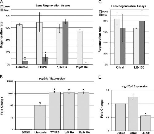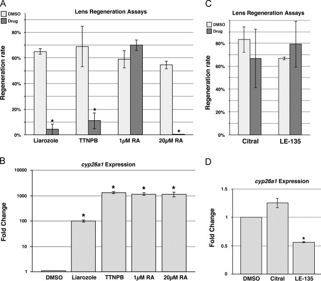 Fig. 2. RA signaling inhibits lens regeneration, and RA signaling antagonism does not inhibit lens regeneration. (A) Liarozole and TTNPB are potent inhibitors of cornea-lens regeneration. A high concentration of RA very strongly inhibits lens regeneration. â indicates p<0.0001, using two-tailed Fischer's exact test. (B) A drug-treatment validation assay using qPCR shows that all of the drugs strongly activate RA signaling, as seen by a profound upregulation of cyp26a1, a marker of active RA signaling, in the cornea. â indicates p<0.01, using unpaired t test. (C) Citral and LE-135, inhibitors of RA signaling, fail to inhibit cornea-lens regeneration. (D) A drug-treatment validation assay using qPCR shows that LE-135 attenuates expression of cyp26a1 in the cornea. â indicates p<0.0001, using unpaired t test. All error bars indicate standard error.