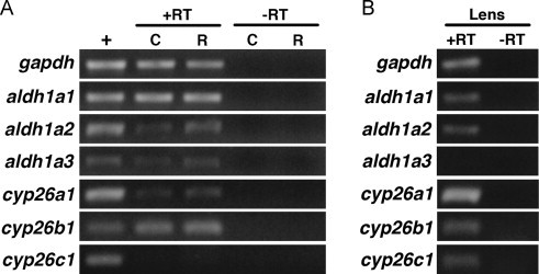 Fig. 1. Expression of RA signaling related genes. (A) Expression of RA-signaling related genes in control corneas (C) and pooled regenerating corneas from 1, 3, and 5 days post-lentectomy (R). “+RT” group indicates reactions that employed reverse transcriptase for generation of cDNA. “–RT” group indicates reactions that used water in place of reverse transcriptase, as a control for genomic contamination. “+” indicates a positive control reaction performed using embryonic RNA. (B) Expression of genes in control lenses.