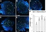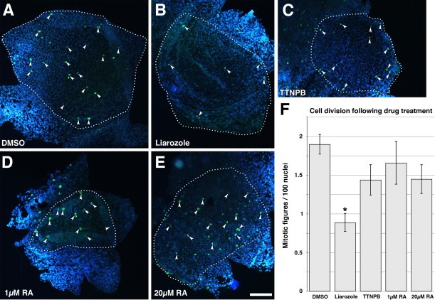 Fig. 4. The effect of CYP26 inhibition, and exogenous retinoids on cell proliferation in the cornea. Nuclei are labeled with Hoechst (blue) and mitotic cells are labeled with anti-phospho-Histone H3 antibody (green). When compared to treatment with DMSO in vitro (A), treatment with TTNPB (C), 1 µM RA (D), or 20 µM RA (E) has no effect on the number of mitotic cells at in the cornea. Treatment with Liarozole (B) reduced cell division. White arrowheads indicate examples of mitotic figures found in the cornea. Note that not every mitotic figure is pointed out in (A) and (E). The white dotted outline demarcates the cornea proper from pericorneal epithelium. The results are quantified in (F). Error bars show standard error. â indicates p<0.0001 using unpaired t-test. Scale bar in E=50 µm.