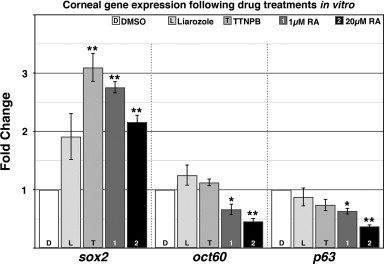 Fig. 5. qPCR of putative corneal stem cell markers. Corneas cultured in vitro in the presence of retinoids show upregulation of sox2, and downregulation of oct60 and p63. CYP26 inhibition with Liarozole does not affect the expression of any of these genes. Error bars show standard error. â indicates p<0.05 and ââ indicates p< 0.001 using unpaired t-test.