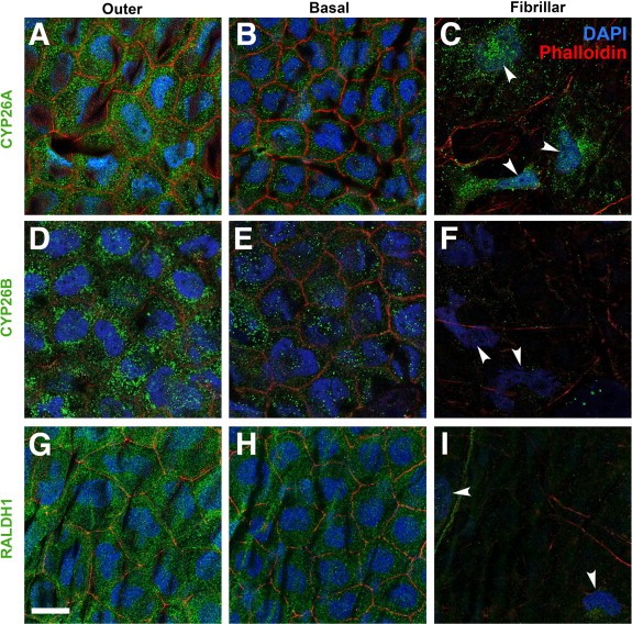 Fig. 6. Cellular localization of CYP26 and RALDH enzymes in the cornea. Corneal whole-mount immunofluorescence staining was used to visualize the expression of CYP26A (AâC), CYP26B (DâF), and RALDH1 (GâI), in each of the 3 layers of the larval corneaâthe outer epithelium (A, D, G), the basal layer (B, E, H), and the deeper fibrillar layer (C, F, I). CYP26A (green) is expressed in all layers, including the sparse cells of the fibrillar layer (arrowheads). CYP26B (green) and RALDH1 (green) are only expressed in the outer epithelial and basal layers, and are not seen in the cells of the fibrillar layer (arrowheads). DAPI (blue), phalloidin (red). Scale bar in G=20 µm.
