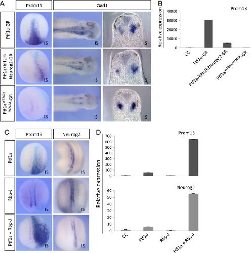 Fig. 5. Prdm13 is activated by the Ptf1-J transcription complex. (A) In situ hybridization analysis of Prdm13 and Gad1 in embryos injected with Ptf1a-GR, Ptf1a/bHLH-Neurog2-GR or Ptf1aW224A/W242A-GR. Dorsal views, anterior to the bottom, of neurula embryos are shown for Prdm13. Whole head dorsal views and transverse sections at the level of the posterior hindbrain are shown for Gad1. (B) Real time RT-PCR analysis of the expression of Prdm13 in stage 16 animal cap explants isolated from embryos overexpressing Ptf1a-GR, Ptf1a/bHLH-Neurog2-GR or Ptf1aW224A/W242A-GR. Note that Prdm13 is dramatically activated in both assays by Ptf1a and to a lesser extent by Ptf1a/bHLH-Neurog2-GR but not by Ptf1aW224A/W242A-GR, which is also unable to activate Gad1. (C) In situ hybridization analysis of Prdm13 and Neurog2 in embryos injected with Ptf1a, Rbp-J, or a combination of Ptf1a and Rbp-J. Dorsal views, anterior to the bottom, of neurula embryos are shown. (D) Real time RT-PCR analysis of the expression of Prdm13 and Neurog2 in stage 16 animal cap explants isolated from embryos overexpressing Ptf1a, Rbp-J, or a combination of Ptf1a and Rbp-J. Note that Rbp-J does not affect Prdm13 nor Neurog2 expression and that the combination of Ptf1a and Rbp-J induces stronger Prdm13 and Neurog2 expression than that induced by Ptf1a alone. In all cases, LacZ mRNA was used as a lineage tracer to identify the injected side. IS, injected side. |