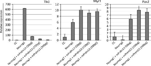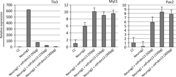 Fig. 8. Real-time RT-PCR analysis of animal cap explants isolated from embryos injected with Neurog2 and Prdm13 mRNA as indicated and collected when sibling embryos reached stage 26. Note that the coexpression of Prdm13 with Neurog2 abrogates its ability to induce Tlx3. Myt1 induction by Neurog2 is in contrast not affected. Pax2 is slightly upregulated by the coexpression of Prdm13. CC, control caps. |