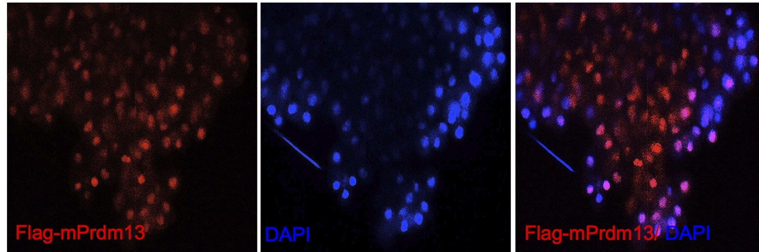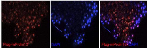 Fig S1.Structure, sequence and subcellular localization of Prdm13. (a) and B) not shown here - see http://www.sciencedirect.com/science/article/pii/S0012160613006817) (A) Schematic representation of the Xenopus laevis Prdm13 protein. (B) Amino acid sequence alignment using Clustal Omega of the predicted Xenopus laevis Prdm13 with the corresponding Xenopus tropicalis, human, mouse and zebrafish sequences. Conserved amino acids in all five species are indicated by asterisks. Colons indicate conservation between groups of strongly similar properties. Periods indicate conservation between groups of weakly similar properties. The conserved PR domain and the zinc fingers are indicated. (C) Subcellular localization of a Flag-tagged mouse Prdm13 protein in animal pole cells of early gastrula embryos. Note that immunoreactivity is only detected in the nucleus. |