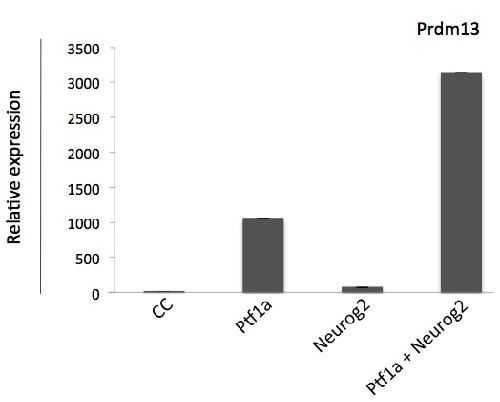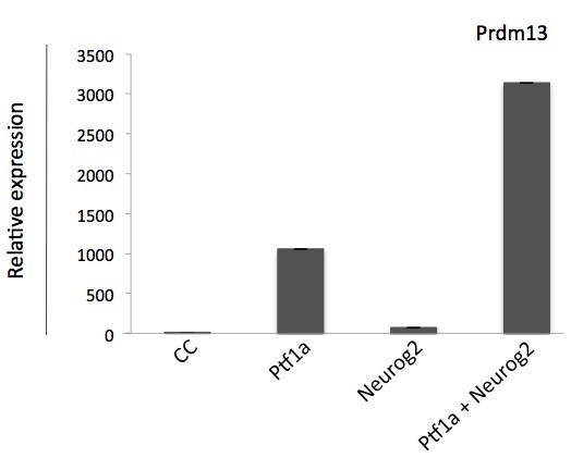 Fig. S5. Neurog2 cooperates with Ptf1a to induce Prdm13. Real time RT-PCR analysis of the expression of Prdm13 in stage 16 animal cap explants isolated from embryos overexpressing Ptf1a-GR and/or Neurog2-GR as indicated. Note that Prdm13 is strongly ectopically activated by Ptf1a-GR, but not by Neurog2-GR. Note also that the combination of Ptf1a-GR and Neurog2-GR induces stronger Prdm13 expression compared to either alone. |