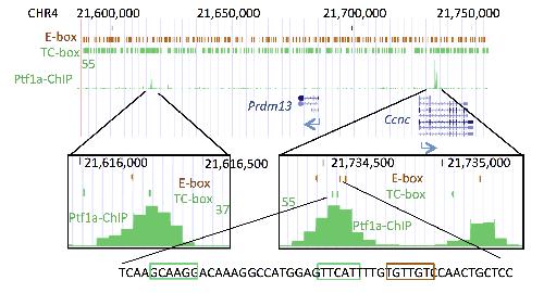 Fig. S6. Ptf1a Chip-seq in the 266-6 pancreatic cell line (as published in Thompson et al. 2012) shows that two strong Ptf1a binding peaks are located at the vicinity of the Prdm13 gene. The upper tracks show the location of E-boxes and TC-boxes. The peaks are magnified below. Green numbers show the number of unique tags. |