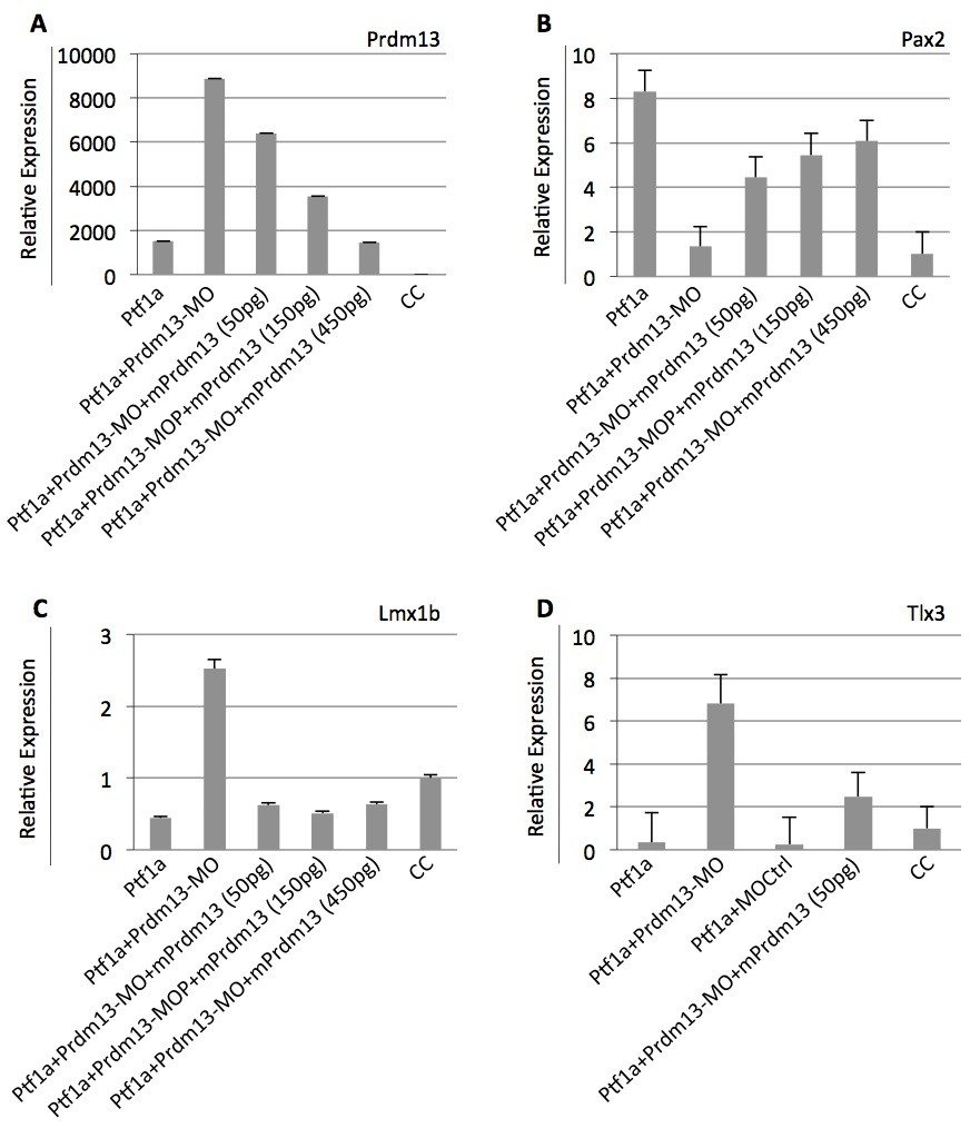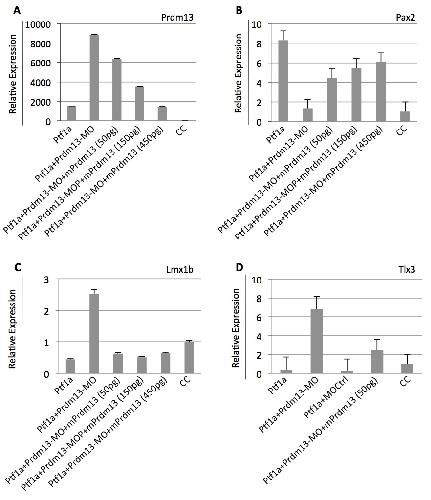 Fig. S8. The Prdm13-MO phenotype in Ptf1a overexpressing caps is rescued by mPrdm13 mRNA injection. (A-D) Real-time RT-PCR analysis of Prdm13, Pax2, Lmx1b and Tlx3 expression in animal caps derived from embryos injected with Ptf1a mRNA, Prdm13-MO and mPrdm13 mRNA as indicated and collected when sibling embryos reached stage 26. Note that the increase of Tlx3, Lmx1b and Prdm13 observed in Ptf1a overexpressing caps due to Prdm13 knockdown is partially rescued by mPrdm13 overexpression. CC, control caps. |