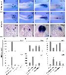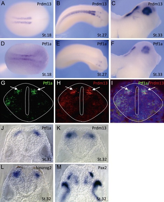 Fig. 2. Prdm13 embryonic expression profile is highly related to that of Ptf1a and overlaps with those of its downstream targets Neurog2 and Pax2 in Xenopus embryos. (AâF) Dorsal or lateral views of Prdm13 and Ptf1a in stage 18, 27 and 33 embryos showing that the two genes have a similar restricted expression in the neural tube. (GâI) Images of transversal sections of the neural tube at the level of the anterior spinal cord of a stage 32 embryo, following double fluorescent in situ hybridization for Prdm13 and Ptf1a. Note the overlap of the two stainings (arrows). (JâM) Transversal sections of the neural tube of stage 32 embryos at the level of the otic vesicles stained with the indicated probes. Note that Ptf1a appears coexpressed with Prdm13, Neurog2 and Pax2 in the dorsal neural tube. While Ptf1a is expressed in the lateral part of the ventricular zone and in the intermediate zone, Prdm13 and Neurog2 strongest expression is detected in the intermediate zone and Pax2 in the marginal zone. Nieuwkoop Faber stages are indicated. |