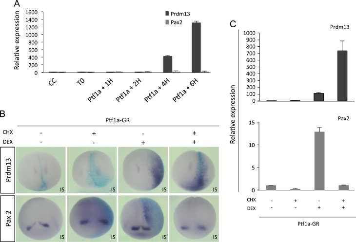 Fig. 4. Prdm13 is a likely direct Ptf1a transcriptional target. (A) Real time RT-PCR analysis of Prdm13 expression in animal cap explants derived from Ptf1a-GR overexpressing embryos either left untreated or exposed to DEX for 1â6 h before harvesting. Pax2, was used as a control. Note that Prdm13 expression is already dramatically induced after 4 h of treatment of DEX. In contrast, Pax2 is not induced at those early time points of induction. CC, control caps. (B) In situ hybridization analysis of Prdm13 and Pax2 in neurula embryos overexpressing Ptf1a-GR, treated with or without CHX for 1 h at stage 12.5 before the addition (or not) of DEX as indicated. LacZ mRNA was used as a lineage tracer. Dorsal views are shown, with anterior to the bottom. IS, injected side. (C) Real time RT-PCR analysis of the expression of Prdm13 and Pax2 in animal caps derived from Ptf1a-GR overexpressing embryos, pretreated or not with CHX before the addition (or not) of DEX as in (B). Note that both in embryos and in animal caps, this CHX treatment does not reduce Prdm13 induction while Pax2 induction is completely abolished. |