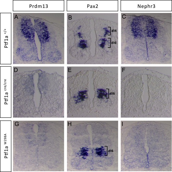 Fig. 6. Prdm13 is lost in mouse Ptf1acre/cre and Ptf1aW298A mutant embryos. (AâF) Expression of Prdm13, Pax2 and Neph3 analyzed by in situ hybridization on coronal sections of the spinal cord of E11,5 Ptf1acre/cre, Ptf1aW298A or Ptf1a+/+ embryos. Note that the strong staining observed in the lateral domain of Prdm13 expression is lost in both mutants. |