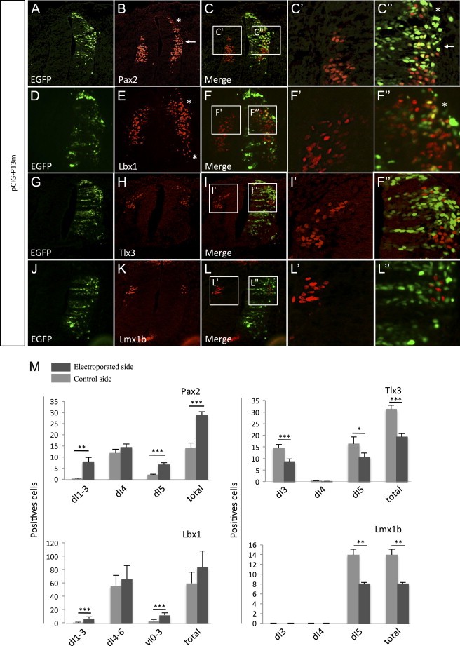 Fig. 9. Prdm13 overexpression induces GABAergic and suppresses glutamatergic markers in the chick neural tube. (AâL) Immunofluorescence on transverse sections of HH24â25 chick neural tube, with the right side of the neural tube electroporated with a mouse pCIG-Prdm13 expression construct with antibodies against Pax2, Lbx1, Tlx3, Lmx1b in red and GFP in green. Note the disappearance of the Pax2 gap of staining between the presumptive dI4 and dI6 neurons (arrow) and the Pax2 staining above dI4 (asterisk). Lbx1 is also detected more ventrally and dorsally (asterisks) upon Prdm13 overexpression. In contrast, Tlx3 in dI3/5 and Lmx1b in dI5 are decreased. High magnification views of the control and electroporated sides in the dorsal half of the neural tube are shown in C'âC'' and F'âF''. In contrast, in I'âI'' and L'âL'', no GFP+ Prdm13 expressing cells are Tlx3+ or Lmx1b+. (M) Quantification of the number of Pax2, Tlx3, Lbx1 and Lmx1b positive cells in the different progenitor regions on the Prdm13 electroporated side compared to the contralateral, control side. P<0.05*, P<0.01**, P<0.001***; (nâ¥3). |