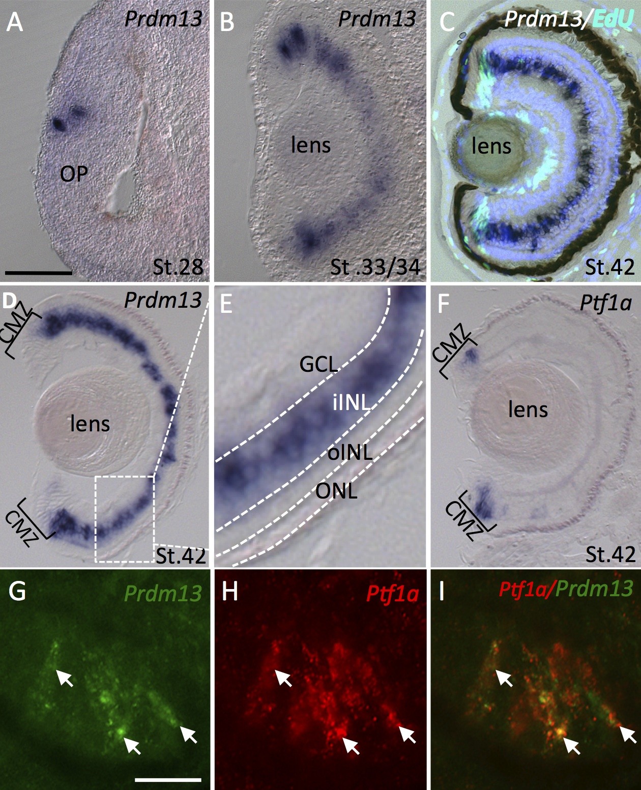Fig. S2. Prdm13 expression in the developing retina. (A, B, D-F) Retinal sections after whole mount in situ hybridization with the indicated probes. (A) Prdm13 transcripts start to be expressed from stage 28 onwards in a subpopulation of retinal progenitors. (B) From stage 33/34, Prdm13 is expressed in the inner nuclear layer. (C) In situ hybridization with Prdm13 on cryostat section and EdU labeling (green) showing that some Prdm13 positive cells in the CMZ are in proliferation. (D-F) At stage 42, Prdm13 is restricted to the inner part of this layer where amacrine cells reside (see the enlargement in E). Prdm13 is also expressed in the ciliary marginal zone (CMZ), excluding the most peripheral region, similarly to Ptf1a. (G-I) Images of stage 40 retinal section focusing on the ventral CMZ region, following double fluorescent in situ hybridization. Many cells co-express Ptf1a and Prdm13 (arrows). OP: optic vesicle, CMZ: ciliary marginal zone, GCL: ganglion cell layer, iINL: inner part of the inner nuclear layer, oINL: outer part of the inner nuclear layer, ONL: outer nuclear layer. Scale bars: 100μm (A-D, F), 50μm (G-I). |