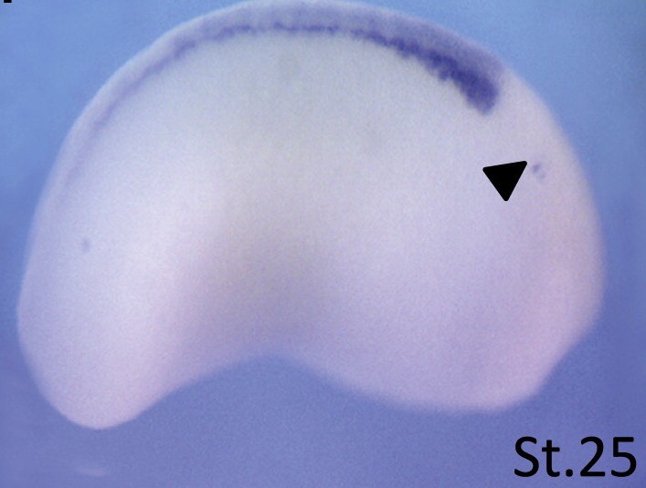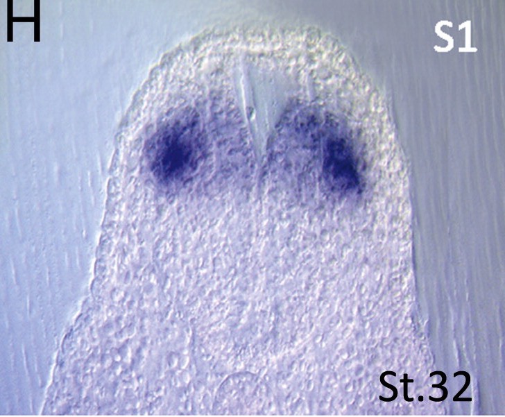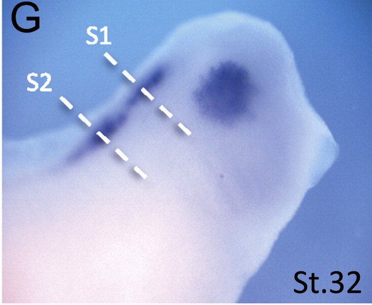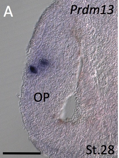 prdm13 (PR domain containing 13) gene expression in Xenopus laevis embryo, assayed via in situ hybridization, NF stage 32, transverse section, dorsal up. |