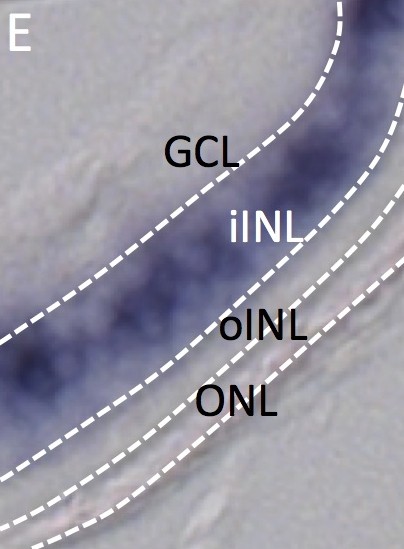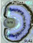 prdm13 (PR domain containing 13) expression in Xenopus laevis embryo, assayed via in situ hybridization, in the developing retina, NF stage 42 |