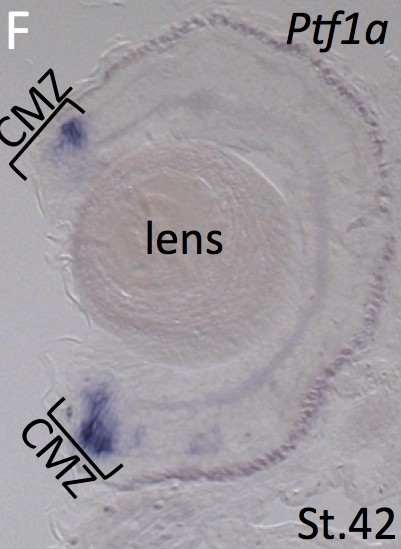 ptf1a (pancreas specific transcription factor, 1a) gene expressionin the developing retina, in Xenopus laevis embryo, assayed via in situ hybridization, NF stage 42. |