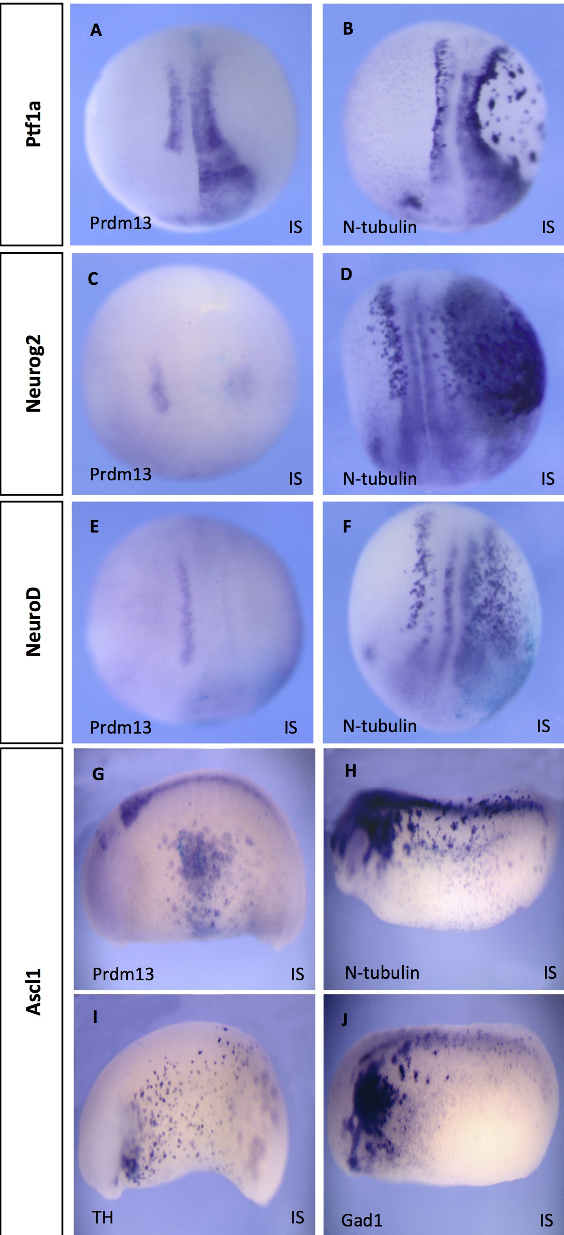 Fig. S4. Effect of the overexpression of non-inducible forms of Ptf1a, Neurog2, NeuroD, or Ascl1 on Prdm13. (A-F) Dorsal views of neurula embryos injected unilaterally with the indicated mRNA and hybrized with a Prdm13 antisense probe. The pan-neuronal marker N-tubulin was used as a control. (I-L) Lateral views of the injected side of tailbud stage embryos misexpressing Ascl1 and hybridized with a Prdm13 antisense probe. N-tubulin, TH and Gad1 were used as controls. In all cases, LacZ mRNA was used as a lineage tracer. Note that Ptf1a and Ascl1 induce induce ectopic Prdm13 expression in the ectoderm and that Neurog2 and NeuroD reduce its expression (Ptf1a: 98% induced, n = 40 for Prdm13 and 93% induced, n = 28 for N-tubulin; Neurog2: 90 % reduced, n = 39 for Prdm13 and 100% induced, n = 27 for N-tubulin; NeuroD: 81% reduced, n = 38 for Prdm13 and 100% reduced, n = 26 for N-tubulin; Ascl1: 76 % induced, n = 38 for Prdm13; 94 %, n = 48 for N-tubulin; 100 % increased, n = 38 for TH; 100 % increased, n = 80 for Gad1). IS, injected side |