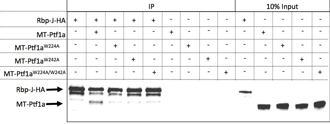 Fig. S7. Xenopus Ptf1aW224A/W242A-GR mutant is unable to interact with Rbp-j. Co-IP using in vitro synthesized and 35S methionine labelled proteins as indicated on the left. The 10% input shows that the proteins were in vitro translated. The Co- IP was performed with an anti-HA antibody. HA-tagged Rbp-j is co-immunoprecipitated with MT-tagged Ptf1a wildtype but not with MT-tagged Ptf1a[W224A], Ptf1a[W242A] or Ptf1a[W224A/W242A]. |