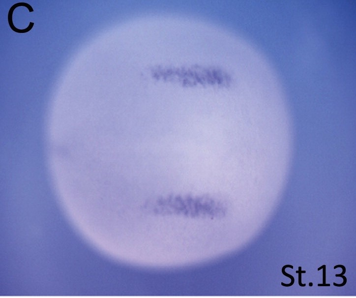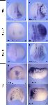 prdm13 ( PR domain containing 13 ) gene expression in Xenopus laevis embryo, assayed via in situ hybridization, NF stage 13, dorsal view, anterior right. |