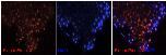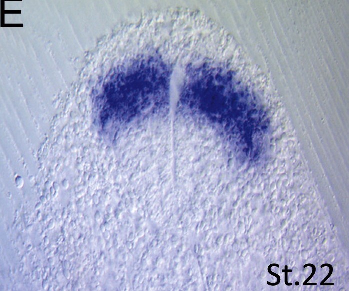 prdm13 (PR domain containing 13) gene expression in Xenopus laevis embryo, assayed via in situ hybridization, NF stage 22, transverse section, mid-region. |