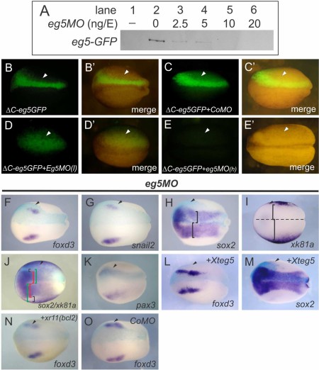 Figure 2. eg5 is required for early neural crest specification in Xenopus embryos. AâE: In vitro and in vivo efficiency of eg5 antisense morpholino oligonucleotide (eg5MO). A: Efficiency of eg5 antisense morpholino oligonucleotide. eg5MO injected and control embryos were cultured until stage 14 and homogenized for total protein extraction. Eg5-GFP protein was detected by Western blotting using an anti-green fluorescent protein (GFP) antibody. Each lane was loaded with 100 μg of total protein. eg5MO inhibits translation of eg5 in a dose-dependent manner. eg5MO concentration is expressed in ng/embryo. BâE: Dorsal views of Xenopus laevis embryos under the fluorescence stereo microscope, anterior side is on the left. White arrowheads indicate the injected side. B', D', E': Fluorescence and clear field images of each embryo are shown in merged images. B, B': Embryo injected with mRNA encoding δC-eg5GFP (1 ng/embryo) showing GFP fluorescence on the treated side. C, C': Embryo injected with δC-eg5GFP mRNA (1 ng/embryo) and control antisense morpholino oligonucleotide (CoMO, 20 ng/embryo). D, D', E, E': Embryos injected with δC-eg5GFP mRNA (1 ng/embryo) and eg5MO (C and C', low dose (l), 10 ng/embryo; D and D', high dose (h), 22 ng/embryo. No embryo shows GFP fluorescence at a high dose of eg5MO. FâO: Analysis of eg5MO effects on neural crest early specification. Dorsal views of Xenopus laevis embryos, anterior side is on the left. Black arrowheads indicate the injected side. F, G: eg5MO-injected embryos show inhibition of foxd3 and snail2 neural crest markers, respectively. H, I: The expression of the neural plate marker sox2 is reduced and the epidermal marker xk81a is expanded on the eg5MO-treated side. Brackets indicate the width of the neural plate (H) and the width of the neural plate plus the neural crest domain (I). J: Embryo labeled by double in situ hybridization for sox2 and xk81a genes showing the reduction of prospective neural crest (black brackets) and neural plate (red brackets) domains in the eg5MO-injected side. Green brackets indicate neural crest and neural plate territories together. This result is identical to H and I. K: The neural plate border specification marker pax3 show reduced expression in the eg5MO-injected side. L, M: Coinjection of eg5MO and Xenopus tropicalis eg5 mRNA rescues foxd3 and sox2 expression, respectively. N: Embryo injected with eg5MO and xr11, the Xenopus bcl2 orthologue. The antiapoptotic factor xr11 did not rescue the expression of foxd3 in the neural crest. O: CoMO-injected embryos show normal expression of foxd3.Download figure to PowerPoint |