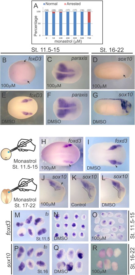 Figure 4. Analysis of eg5 temporal requirements in neural crest development. A: Evaluation of early effect of monastrol on Xenopus embryos development. Sixteen-cell-stage embryos were incubated in increasing concentration of monastrol. Embryos show normal segmentation up to 500 μM monastrol, while 750 μM arrested development of almost 50% of embryos. Number of embryos for each treatment are in parenthesis. B, C, E, F, H, I: Dorsal view of embryos. Anterior side is on the right. D, G; JâL: Lateral views of embryos, anterior side is on the right. B, D: Embryos incubated in NAM solution containing monastrol show an almost complete depletion of foxd3 (arrows in B) and sox10 (arrow in D) expression compared to DMSO-incubated embryos (B, F). C: Embryos incubated in monastrol show normal paraxis mesodermal marker expression, compared with sibling control (F). H, I: Embryos were grafted at stage 11.5 on the right neural fold with a monastrol-soaked bead (H) or DMSO-soaked bead (I) and fixed at stage 15. Monastrol-soaked beads grafted in stage 11.5 produced a decrease in the expression of neural crest markers foxd3 (H) while no effect on foxd3 was observed when control DMSO containing beads were grafted on embryos (H). Arrowhead, treated side. J: Stage-17 embryos were grafted on the right neural crest region with a 100-μM monastrol-soaked bead. Embryos were cultured until stages 21â23 and the expression pattern of sox10 marker shows arrested neural crest cell migration and the accumulation of these cells laterally to the hindbrain. The leading edge of migration is indicated by dotted lines. K, L: Non-grafted embryos and embryos grafted with control DMSO-soaked beads show normal neural crest migration. MâR: Neural crest explants were dissected including the underlying mesoderm from stage-11.5 and stage-16 embryos. M, P: Groups of explants were fixed immediately (t0) after excision at stages 11.5 or 16. Groups of explants were cultured until stage 15 (N, O) or stage 22 (Q, R) in the presence of monastrol or DMSO vehicle. O, R: The neural crest explants isolated at stage 11.5 and cultured until stage 15 or dissected at stage 16 and incubated until stage 22 in the presence of 100 μM monastrol lose foxd3 and sox10 expression, respectively.Download figure to PowerPoint |