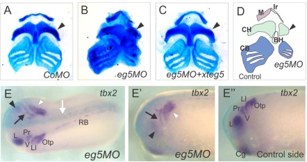 Figure 6. eg5 is required for the formation of neural crest derivatives formation. AâC: Craniofacial cartilages preparations of stage-46 tadpoles, Alcian blue staining. Ventral view, anterior side is at the top. Injected side is indicated by an arrowhead. A: Control morpholino CoMO-injected embryos show no effects on the treated side. B: eg5MO injected side of embryos (arrowhead) present a marked reduction in Meckel's, ceratohyal and ceratobranchial cartilages. C: The coinjection of eg5MO and Xenopus tropicalis eg5 mRNA rescues normal cartilages morphology. D: Schematic representation of eg5MO effects on Xenopus head cartilages. E, E', E'': eg5MO-injected embryos show altered Rohon-Beard sensory neurons and cranial ganglia precursors derivatives. Notice that tbx2 expression pattern was altered in the injected side of embryos. M, Meckel's cartilage; CH, ceratohyal cartilage; CB, ceratobranchial cartilage; Ir, infrarostral cartilage; BH, basihyal cartilage; Pr, profoundal placode; L, lens placode; Ll, lateral line placode; V, trigeminal placode; Cg, cement gland; RB, Rohon-Beard sensory neurons. A-D, black arrowhead, injected side. E, E', white arrowhead, injected side; black arrow, cranial ganglia precursors; black arrowhead, lens placode; Otp, otic placode.Download figure to PowerPoint |