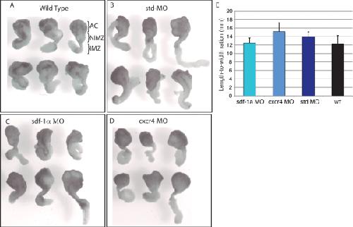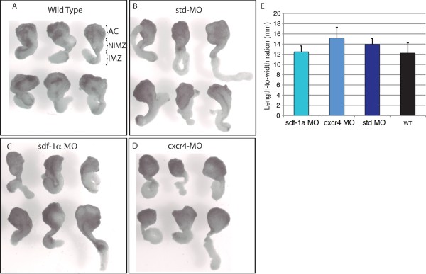 Figure 3. Sdf-1α and cxcr4 are not required for convergent extension. Keller sandwiches made from stage-10 wild type (A), standard MO (B), sdf-1α MO (C), and cxcr4 MO (D) embryos undergo the characteristic convergent extension to form a long and narrow array of cells. E: Length-to-width ratio of Keller sandwiches reveal no significant differences between explants made from sdf-1α and cxcr4 morphant tissue compared to the controls. Statistical analysis was carried out by using the Student's t-test. Error bars indicate standard error. AC, animal cap; NIMZ, non-involuting marginal zone; IMZ, Involuting marginal zone.