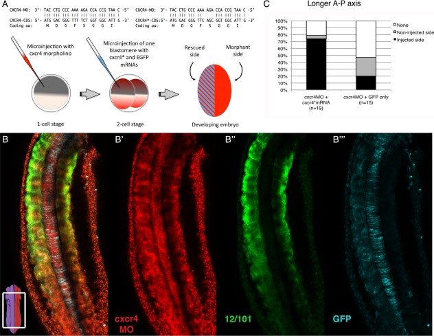 Figure 7. Morpholino-resistant cxcr4* mRNA rescues the cxcr4 morphant phenotype. A: Top: Comparison between endogenous cxcr4 and MO-resistant cxcr4* 5â² coding region sequences (MO binding site). Bottom: Diagram of the experimental strategy, which consists of embryos injected at the one-cell stage with cxcr4 MO, and at the two-cell stage with MO-resistant cxcr4* mRNA and EGFP mRNA (lineage tracer) in one of two blastomeres. B: A merged image of a stage-25 cxcr4 MO rescued embryo. Bottom left: Diagram of an embryo indicating the region imaged. Subsequent series shows individual channels: B': lissamine-tagged cxcr4 MO; B'': muscle fibers stained with 12/101; B''': AlexaFluor anti-GFP indicating the rescued side. Anterior is at the top. C: Graph showing the percentages in which a specific half of the embryo (injected or non-injected) has a longer axis. In some cases neither side is longer and is thus, scored as ânone.â