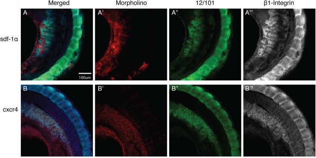 Figure 8. β1-integrin distribution in sdf-1α and cxcr4 morphant tissue. Merged images (MO-lissamine, 12/101, and β1-integrin) of stage-26 embryos (A) sdf-1α and (B) cxcr4 half-morphant embryos. A',B': Distribution of the lissamine-tagged MO. A'',B'': Expression pattern of the muscle-specific marker, 12/101. A''',B''': Images were converted to black and white to better visualize the distribution of β1-integrin staining on the morphant side in comparison to the wild type side. Scale bar in A applies to all frames. Anterior is at the top.