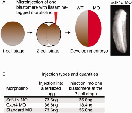 Figure 1. Experimental approach to the morpholino knockdown of sdf-1α and cxcr4. A: A schematic of the experiment in which one blastomere at the 2-cell stage is injected with a specific morpholino (MO) such that only half of the embryo is morphant. The embryo is then allowed to develop to tailbud stages and then fixed and analyzed. B: A table indicating the specific amounts of MO injected into the fertilized egg or one blastomere at the two-cell stage.