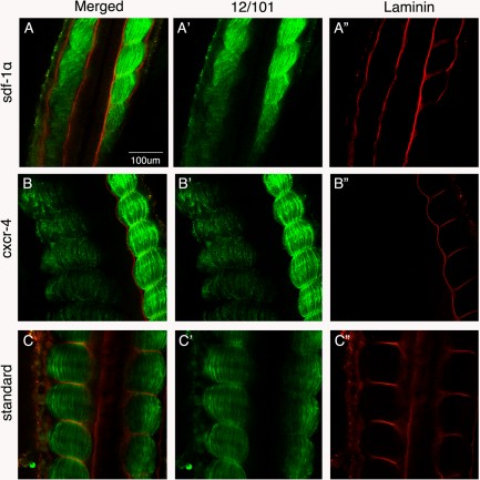 Figure 10. Laminin expression is severely diminished by the depletion of sdf-1α and cxcr4. Stage-26 (A) sdf-1α, (B) cxcr4, and (C) standard half-morphant embryos showing a merged imaged (12/101 and laminin). A'-C': Distribution of the muscle-specific marker, 12/101. A''-C'': Immunolocalization of laminin on the morphant side in comparison to the control side. Scale bar in A applies to all frames. Anterior is at the top.