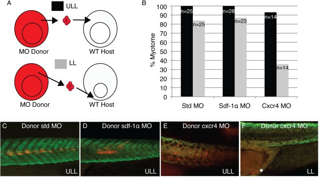 Figure 11. Cell transplantations reveal a role for cxcr4 in the migration of lower lip mesoderm cells. A: Cells from standard, sdf-1α, or cxcr4 morphant embryos were grafted from the upper lateral lip (ULL) region of the blastopore at the mid-gastrula stage to either the ULL or lower lip (LL) region of wild type host embryos at the same stage. B: Grafted embryos developed to stage 39 at which time their ability to form myotome fibers was determined. Confocal images showing that standard (C), sdf-1α (D), and cxcr4 (E) morphant cells give rise to myotome fibers when grafted to the ULL region of wild type embryos. F: A confocal image showing cxcr4 morphant cells grafted to the LL region fail to migrate dorsally and remain closely associated with their original position near the future anus of the tadpole (see white star).