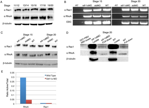 Figure 12. RhoA and Rac1 activation through sdf-1α signaling pathway. A: Western blot analysis reveals the constant presence of Rac1 and RhoA protein between X. laevis stages 11 and 20. β-Tubulin was used as a protein loading control. B: RT-PCR analysis shows that Rac1 and RhoA are expressed in sdf-1α morphants at the same level as in the standard morphants and wild type embryos at stages 15 and 20. ODC was included as a loading control. C: Western blot analysis shows no difference in total Rac1 and RhoA protein levels between sdf-1α morphants and controls (standard morphant and wild type embryos) at stages 15 and 20. β-Tubulin was used as a protein loading control. D: Western blot analysis shows the level of activated RhoA and Rac1 in stage-20 sdf-1α morphant and wild type embryos. β-Tubulin was included as a protein loading control. E: A graph showing the ratio between active and total Rac1 and RhoA proteins at stage 20 in sdf-1α morphants and controls.