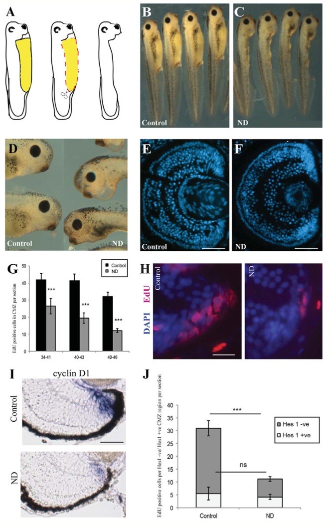 Fig. 1. Nutrient deprivation causes a decrease in CMZ proliferation. (A) The nutrient deprivation (ND) procedure. The yolk-rich gut (yellow area), which feeds the embryo, was removed by dissection (red dashed line), leaving the animal in a nutrient- deprived state. Xenopus ND embryos appeared developmentally and morphologically normal 2 days after yolk dissection when compared with control animals (B), but were smaller (C) with smaller eyes (D; control on left, ND embryo on right). (E,F) The cross-sectional area of the whole retina was reduced after ND. ND also reduced the size of the ciliary marginal zone (CMZ) (H) and decreased CMZ proliferation as measured by EdU incorporation after a 2-hour pulse (G,H). In G, embryos were nutrient-deprived during the stages shown. n=10-20 retinas per condition. (I) ND decreases both the domain and intensity of cyclin D1. (J) ND significantly decreased EdU incorporation in progenitor (Hes1 negative) cells but did not affect proliferation in the Hes1-positive stem cell population. n=3, 12 embryos/condition. (G,J) Error bars show 95% confidence intervals; ***Pâ¤0.001 (unpaired t-test); ns, not significant. Scale bars: 100 μm (E,F); 50 μm (H,I). |