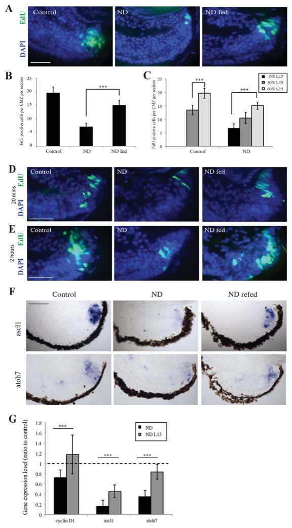 Fig. 4. Re-feeding promotes reconstitution of the CMZ. (A,B) Explanted retinas from ND embryos grown in L15 medium containing sugars and amino acids for 24 hours showed an increase in CMZ proliferation after a 2-hour pulse with EdU. n=3, 18 retinas/condition. (C) This increase in proliferation varied with nutrient levels, suggesting that nutrients can regulate proliferation within a dynamic range. n=3, 18 retinas/condition. (D,E) Proliferation was initiated in the CMZ as early as 20 minutes after re-feeding (D), with robust proliferation being observed 2 hours after the addition of nutrients (E). (F,G) After culture for 24 hours in L15, a strong upregulation of Cyclin D1 and the proneural genes ascl1 and atoh7 was observed in re-fed retinas. n=3, 18 retinas/condition. (B,C,G) Error bars show 95% confidence intervals; ***Pâ¤0.001 (unpaired t-test). Scale bars: 50 μm (A,D,E,F). |