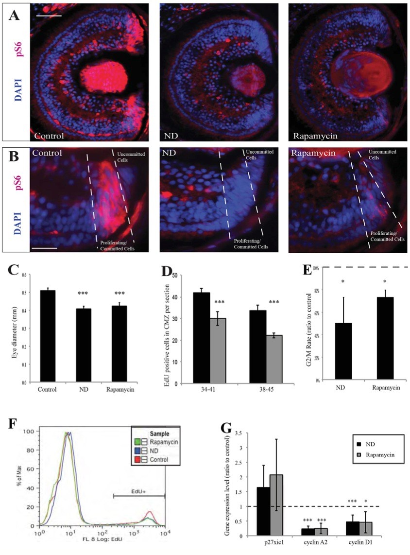 Fig. 5. The mTOR pathway is involved in the nutrient-sensitive restriction point. (A) The CMZ stained strongly for the mTOR target pS6 (red) in control embryos, whereas pS6 staining was lost in the CMZ of ND embryos or in embryos treated with the mTOR inhibitor rapamycin (n=40/40 embryos). (B) Within the CMZ, pS6 was present in committed progenitors but not in undifferentiated stem/progenitor cells (n=40/40 embryos). (C) Rapamycin or ND resulted in a significantly reduced eye size in stage 41 embryos. n=3, 12 embryos/condition. (D) Rapamycin treatment during stages 38-45 significantly reduced the number of proliferative cells in the CMZ. n=5-12 retinas. (E,F) ND or rapamycin reduced the fraction of G2/M cells that were EdU positive after a short EdU pulse (E), suggesting G2/M slowdown, and reduced the overall percentage of EdU- positive cells in the retina (F) from 13% in controls to 9% in rapamycin-treated and 7% in ND embryos. n=3 experiments. (G) Expression levels for the cell cycle genes cyclin D1, cyclin A2 and p27Xic1. ND and rapamycin expression levels are shown as ratio to control. n=6, 24 embryos/condition. (C-E,G) Error bars show 95% confidence intervals; ***Pâ¤0.001, *Pâ¤0.05 (unpaired t-test). Scale bars: 100 μm (A); 50 μm (B). |