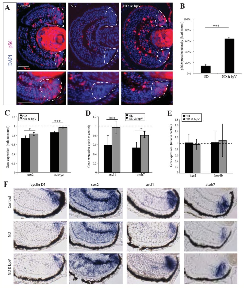Fig. 7. Activation of mTOR signalling is sufficient to maintain the progenitor pool. (A,B) Activation of mTOR with bpV rescues pS6 to a level 70% of that of controls in ND retinas (top row), specifically in CMZ progenitor cells (bottom row). Dashed lines encircle the CMZ. n=4, 16 embryos/condition. (C-F) bpV treatment rescued the downregulation of genes observed following ND, without affecting the expression of stem cell markers. n=4, 16 embryos/ condition. (B-E) Error bars show 95% confidence intervals; ***Pâ¤0.001, *Pâ¤0.05 (unpaired t-test). Scale bars: 100 μm (A, top panel); 50 μm (A, bottom panel); 50 μm (F). |