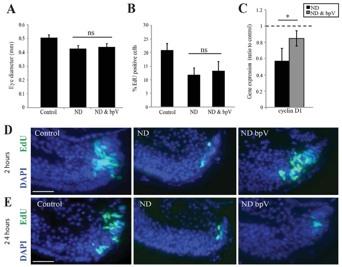 Fig. 8. Activation of mTOR signalling is sufficient to initiate, but not maintain, progenitor proliferation. (A-C) Eye size at stage 41 was not rescued by bpV (A), nor was proliferation (B), despite expression of Cyclin D1 being significantly higher than in ND embryos (C). n=4, 16 embryos/condition. Error bars show 95% confidence intervals; *P≤0.05 (unpaired t-test). (D,E) In explanted cultures a short-term incubation (2 hours) with bpV was sufficient to initiate proliferation in ND retinas; however, bpV treatment was not sufficient to maintain proliferation for longer periods. n=4, 20 retinas/condition. Scale bars: 50 μm (E,F). |