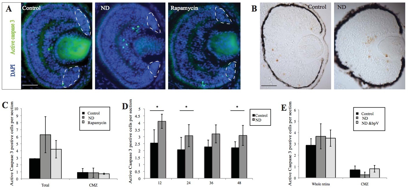 Sup.Fig.2 Decreased proliferation is not the result of increased cell death ND and Rapamycin treatment for two days does not result in increased CMZ cell death indicated by active caspase 3 staining (A) or TUNEL (B), however the number of apoptotic cells was increased in the differentiated retina (C). (D) Apoptosis was initially slightly higher in the retina at 12, 24 and 48 hours after ND when compared to controls. (E) bpV treatment did not affect the number of active caspase 3 positive cells. All error bars show 95% C.I. *p=<0.05. (n=3, 12 retinas/condition). Scale bars = 100μm |