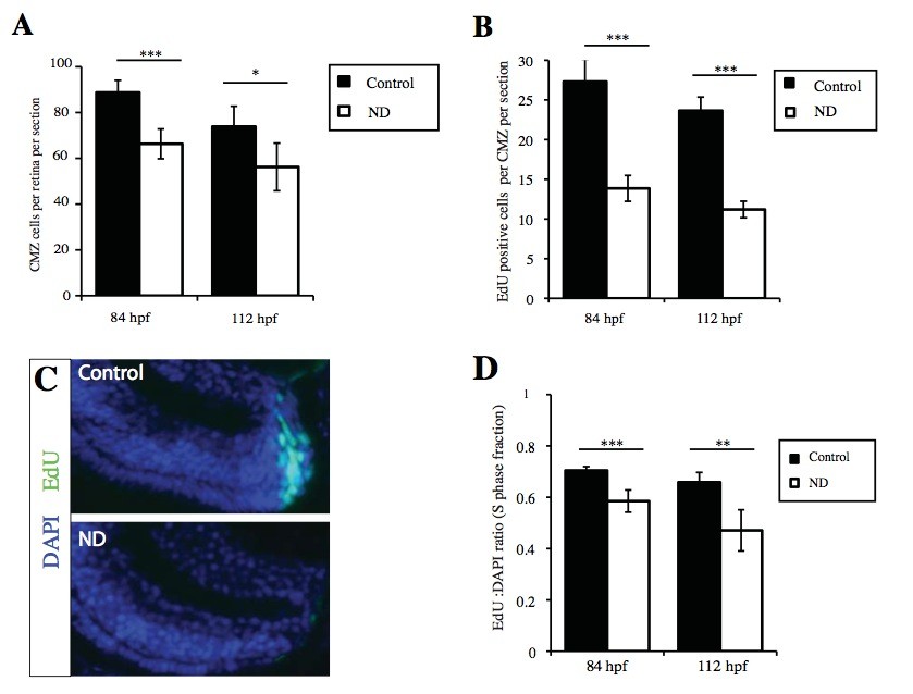 Sup.Fig.4 ND also results in decreased proliferation in the Zebrafish retinal CMZ CMZ proliferation was significantly decreased in 84hpf and 112hpf nutrient deprived zebrafish at 56hpf. Nutrient deprived fish had fewer CMZ cells (A) and decreased EdU incorporation (B-C). (D) The proportion of CMZ cells that were EdU positive in S phase decreased suggesting cell cycle slowdown. Error bars show 95% C.I. Unpaired t test, n=9-29 retinas ***p=<0.001, **p=<0.01, *p=<0.05 |