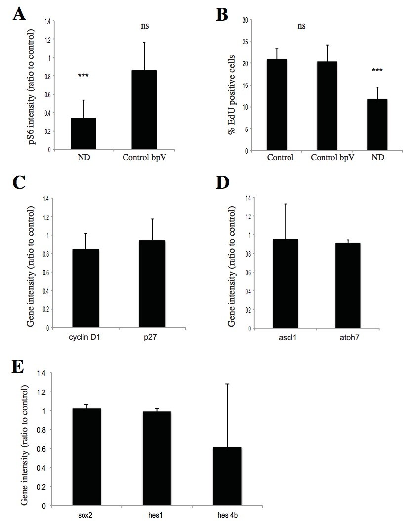 Sup.Fig.7 bpV has no significant effects on control retinas (A) Treatment with bpV did not significantly change pS6 levels in control retinas (n=4, 12 embryos/condition). Error bars show 95% C.I. Unpaired t test -***p=<0.001, **p=<0.01, *p=<0.05. (B) Levels of EdU incorporation were not significantly different to controls (n=4, 12 embryos/condition). Error bars show 95% C.I. Unpaired t test. (C) Expression of cell cycle regulators, proneural genes (D) and progenitor/ stem cell markers (E) was not affected by bpV treatment in control retinas. |