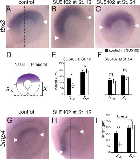 Figure 5. Inhibition of Fgfrs during the eye field stage results in expansion of dorsal markers in the nasal retina. AâC: Representative images of tbx3 expression in the eyes of Stage 32 embryos exposed to control or SU5402 solutions for 5 hr at Stage 12 (A, B), or Stage 24 (C). The ventral boundary of expression domains is indicated (arrowheads). D: The distance from the ventralretina to the ventral boundary of the tbx3 or bmp4 expression domains in the nasal (X-N) and temporal (X-T) retina was measured in control- and Fgfr inhibitor-treated embryos. E, F: The tbx3 expression domain is expanded in the nasal retina (therefore the distance to the base of the domain is diminished) and unchanged in the temporal retina after SU5402 treatment at Stage 12 (E; N=4 experiments with a minimum 8 embryos/group), and unchanged in both the nasal and temporal retina after treatment at Stage 24 (F; N=3 experiments with a minimum of 8 embryos/group). G, H: Lateral view of the eyes of Stage 32 embryos treated with a control or SU5402 solution at Stage 12. I: The bmp4 domain is expanded in the nasal retina and unchanged in the temporal retina (bmp4, N=2 experiments with a minimum of 7 embryos/group). Values in graphs are mean distanceâ±âSEM; means were compared using unpaired t-tests. *Pâ<â0.05, **Pâ<â0.01). Grey dashed line in A, B, C, G, H indicates the outline of the developing neural retina, and the black dashed line divides the retina into nasal and temporal halves.Download figure to PowerPoint