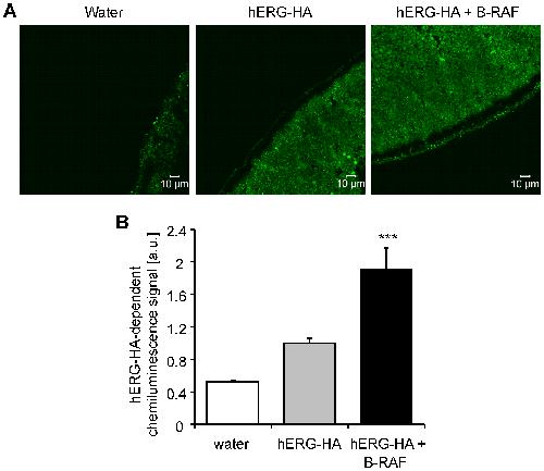 Figure 2. Coexpression of B-RAF increased hERG-HA protein abundance at the surface of hERG-expressing Xenopus oocytes.