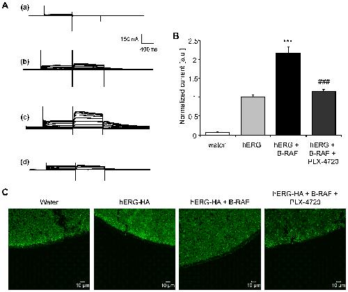 A. Original tracings recorded in Xenopus oocytes injected with water (a), with cRNA encoding hERG alone (b) or with cRNA encoding hERG together with wild-type B-RAF without (c) and with (d) treatment with B-RAF inhibitor PLX-4720 (10 �M, 24 hours). The Xenopus oocytes were depolarized from −80 mV holding potential to different voltages followed by a 500 ms repolarization to −60 mV evoking outward tail currents. B. Arithmetic means � SEM (n = 12�46, arbitrary units) of the normalized outward tail current following a depolarization to +70 mV, recorded in Xenopus oocytes injected with water (white bar), with cRNA encoding hERG alone (light grey bar), or with cRNA encoding hERG together with wild-type B-RAF without (black bar) and with (dark grey bar) treatment with B-RAF inhibitor PLX-4720 (10 �M, 24 hours). ***(p<0.001) indicates statistically significant difference from Xenopus oocytes expressing hERG channels alone; ###(p<0.001) indicates statistically significant difference from Xenopus oocytes expressing hERG together with B-RAF without treatment with PLX-4720. C. Confocal images of hERG-HA protein cell surface expression in Xenopus oocytes injected with water (first panel), with cRNA encoding hERG-HA alone (second panel) or with cRNA encoding hERG-HA together with wild-type B-RAF without (third panel) or with (last panel) treatment with B-RAF inhibitor PLX-4720 (10 �M, 24 hours). Images are representative of three independent experiments.