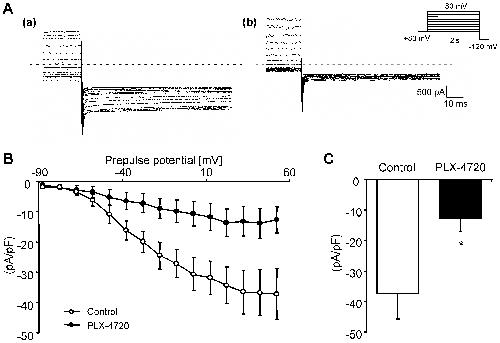A. Inward currents elicited in a bath solution containing 40: the membrane potential was held at −80 mV and then after the preconditioning step from −80 mV to +60 mV for 2 s stepped to the test potential of −120 mV for 500 ms. The currents were measured in rhabdomyosarcoma RD cells after 24 hours treatment with vehicle alone (a) or with 10 �M B-RAF inhibitor PLX-4720 (b). B. Mean peak current density � SEM (n = 5�12) plotted against the precondition potential in rhabdomyosarcoma RD cells after 24 hours treatment with vehicle alone (white cycles) or with 10 �M B-RAF inhibitor PLX-4720 (black cycles). C. Mean peak current density � SEM (n = 5�12) measured at −120 mV after the precondition potential to +50 mV in rhabdomyosarcoma RD cells after 24 hours treatment with vehicle alone (white bar) or with 10 �M B-RAF inhibitor PLX-4720 (black bar). *(p<0.05) indicates statistically significant difference from rhabdomyosarcoma RD cells treated with vehicle alone.