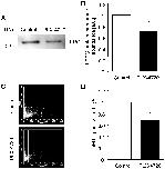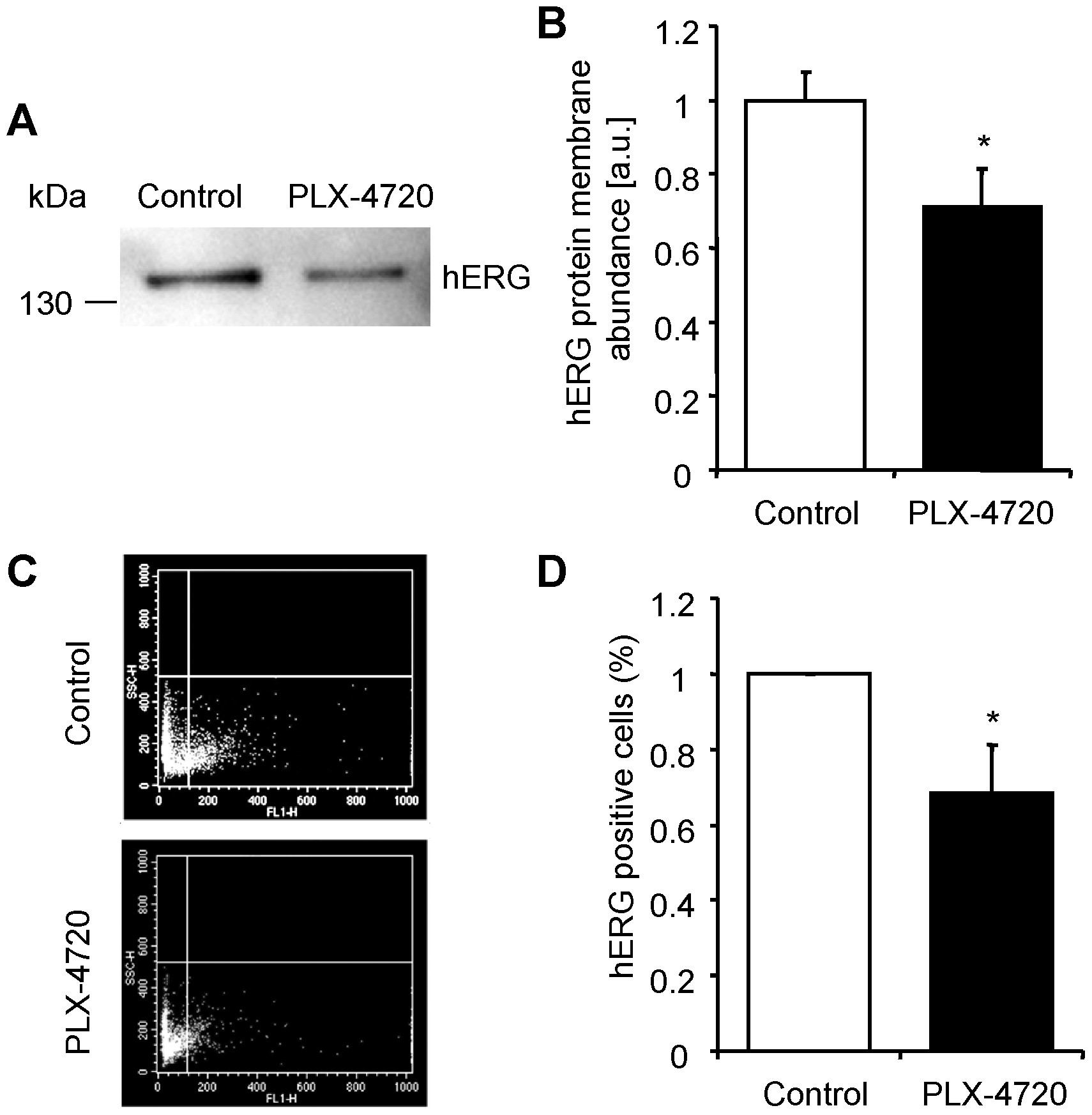 A. Representative original western blot showing hERG membrane protein abundance (anti-Kv11.1 antibody, Alamone Labs) analyzed by cell surface biotinylation in rhabdomyosarcoma RD cells after 24 hours treatment with vehicle alone (Control) or with 10 �M B-RAF inhibitor PLX-4720 (PLX-4720). B. Arithmetic means � SEM (n = 7, arbitrary units) of normalized hERG membrane protein abundance analyzed by cell surface biotinylation in rhabdomyosarcoma RD cells after 24 hours treatment with vehicle alone (white bar) or with 10 �M B-RAF inhibitor PLX-4720 (black bar). *(p<0.05) indicates statistically significant difference from rhabdomyosarcoma RD cells treated with vehicle alone. C. Representative original dot plots of hERG-FITC positive cells at the cell surface analysed by flow cytometry in rhabdomyosarcoma RD cells after 24 hours treatment with vehicle alone (Control) or with 10 �M B-RAF inhibitor PLX-4720 (PLX-4720); FL-1 Height: hERG-FITC fluorescence intensity. D. Arithmetic means � SEM (n = 5, %) of normalized percentage of positive cells showing hERG expression at the cell surface analyzed by flow cytometry in rhabdomyosarcoma RD cells after 24 hours treatment with vehicle alone (white bar) or with 10 �M B-RAF inhibitor PLX-4720 (black bar). *(p<0.05) indicates statistically significant difference from rhabdomyosarcoma RD cells treated with vehicle alone.