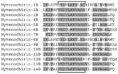 Figure 3. Alignment of all known and predicted hymenochirin peptides.Amino acids shared by more than 50% of the peptides are marked in grey. Brackets delineate a conserved central sequence motif.