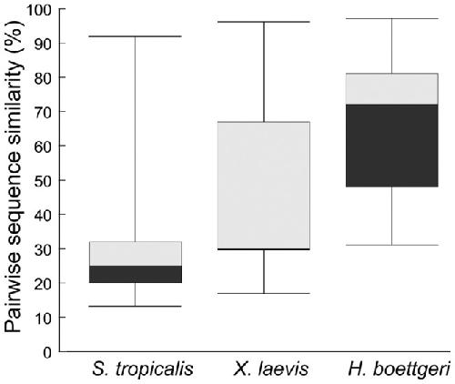 Figure 4. Comparison of pairwise sequence similarities between AMPs of H. boettgeri, S. tropicalis and X. laevis.Box plots comparing the distribution of pairwise sequence similarities (in %) between the 14 hymenochirins of H. boettgeri and all known AMP peptides of S. tropicalis and X. laevis respectively. Boxes indicate median, and 25- and 75- percentiles, and whiskers indicate minimum and maximum values.